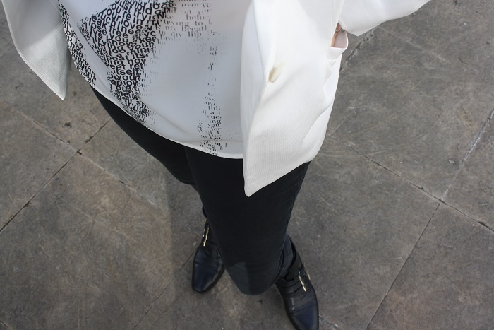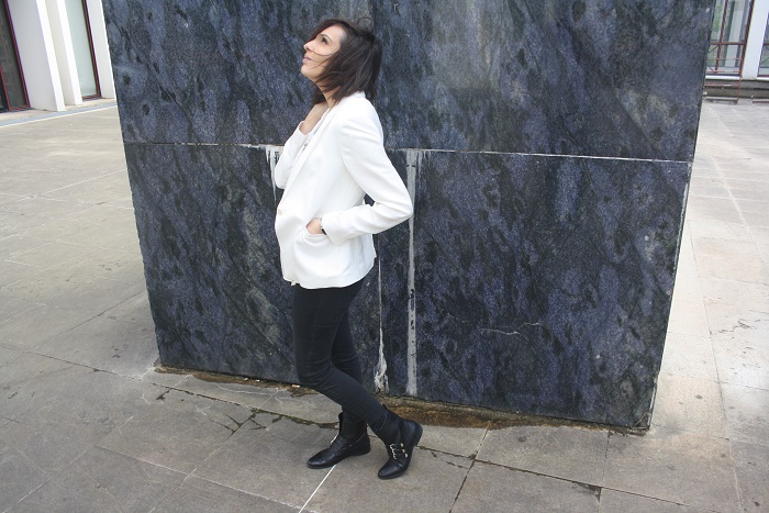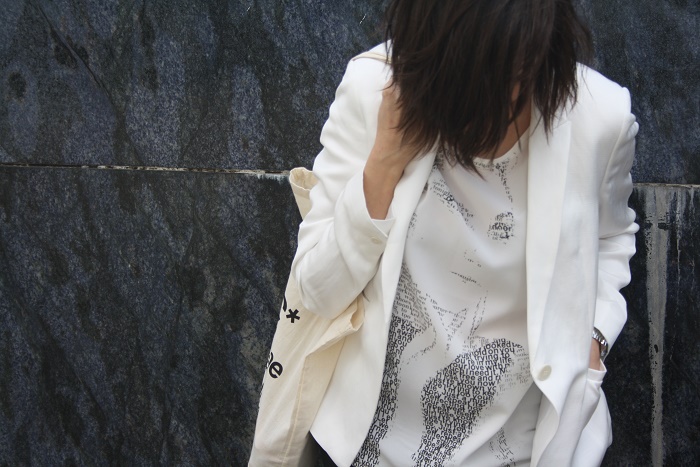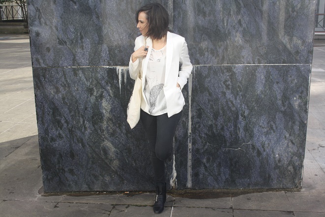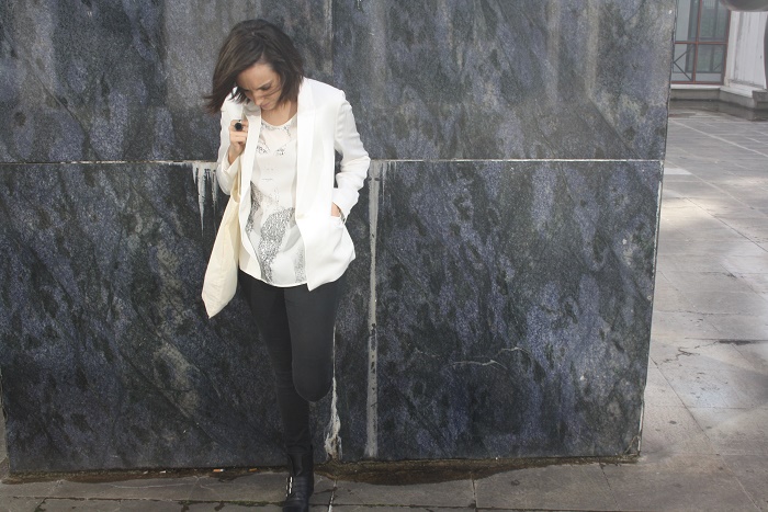 Bon basic, elle va avec tout! Pour ce look, j’ai fait très simple un slim noir et une petite blouse blanche à motif! Mais je pourrais très bien la porter avec un jean et mes converses blanches…Par contre et je pense que c’est pour cette raison que je n’ai jamais acheté de veste blanche, car il faut dire que j’ai eu peur horrible de la tâche (je suis une grande maladroite). A moi de faire gaffe!