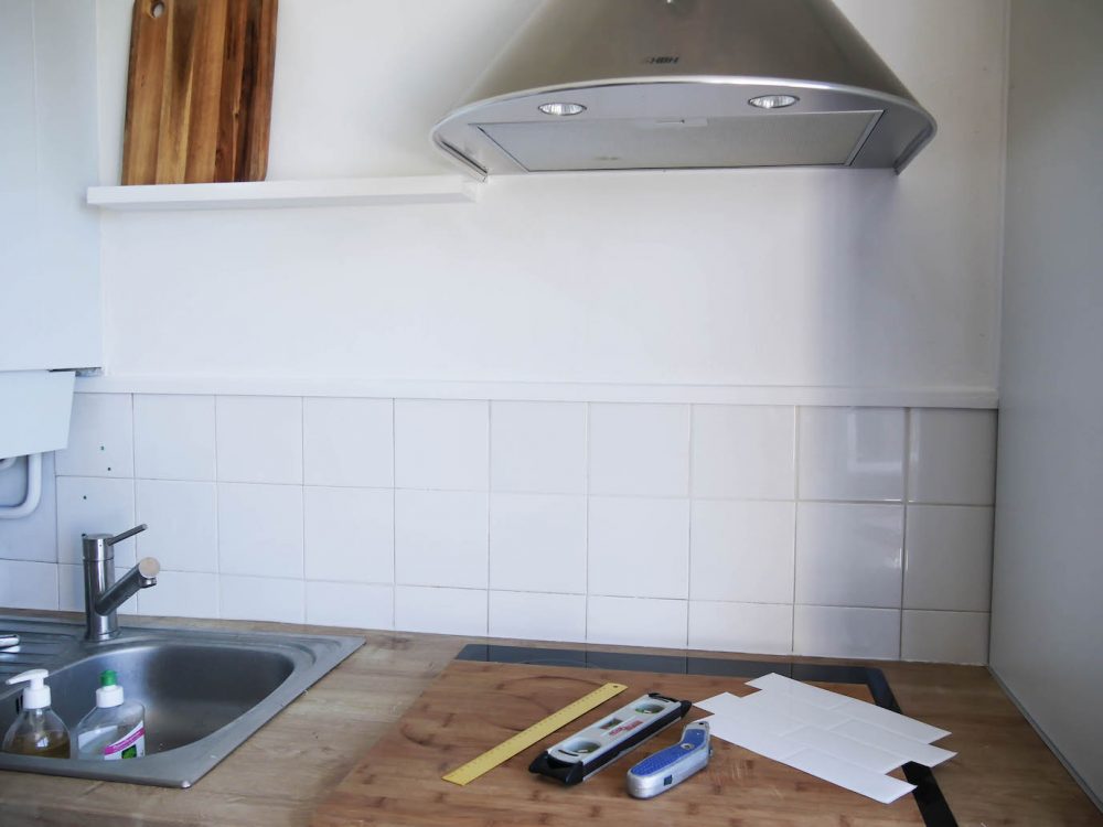 Pour cette étape, nous avons eu l’aide de THE SMART TILES. C’est une marque canadienne qui produit des carreaux autocollants de très bonne qualité pour recouvrir une ancienne crédence (type carrelage) sans travaux importants. La pose est promise comme simple et il y a même un outil hyper pratique en ligne pour calculer le nombre de dalles nécessaires pour éviter de dépenser de trop. Sur le papier (ou sur l’écran en fait…) c’est simple. Et en vrai ça donne quoi ?